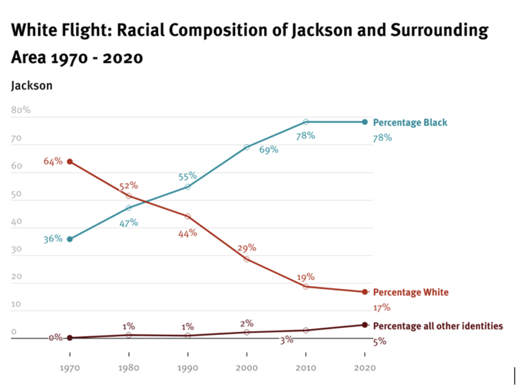In the post-civil rights era, Jackson experienced dramatic white flight, partially encouraged by organizations like the White Citizens Council, which initiated a campaign to encourage white families to move to avoid integration. The group wrote about integration, “If we quit resisting, we will be committing cultural, and probably racial, suicide.” Jackson’s population over a few decades went from being two-thirds white to over three-quarters Black. The city eventually began electing Black representatives to lead the police and courts and manage municipal resources.