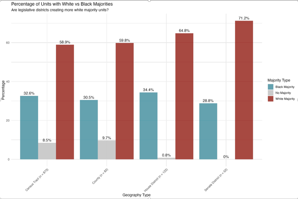 State Senate and House boundaries are much less diverse and create more white majority units than counties or census tracts. Between 8.5 and 9.7 percent of census tracts and counties have no majority race, with both Black and white populations below 50 percent. Yet no Senate districts and only 1 house district are designed without a clear race majority.
