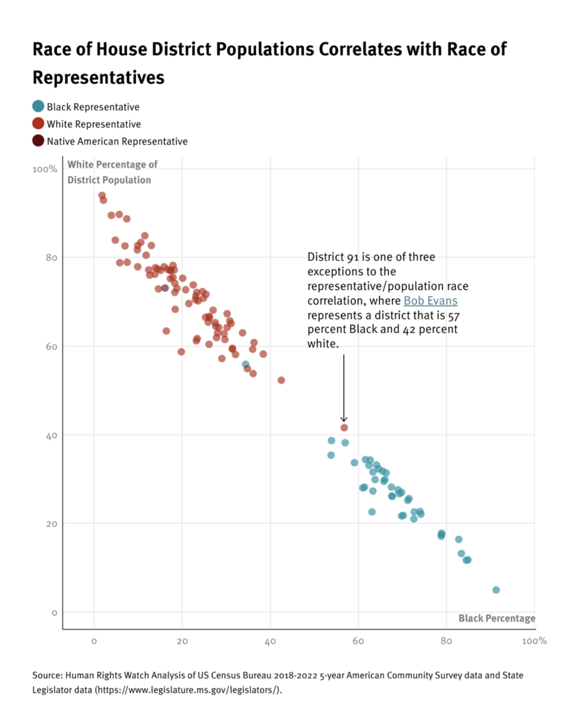 With few exceptions, political boundaries drawn in a way in which white representatives are rarely electorally accountable to Black voters and comprise the majority of the legislature.