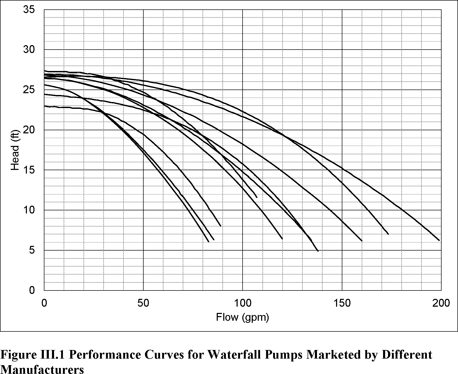 Note the “reference system curve” is a flat head value for waterfall pumps and pressure cleaner booster pumps.