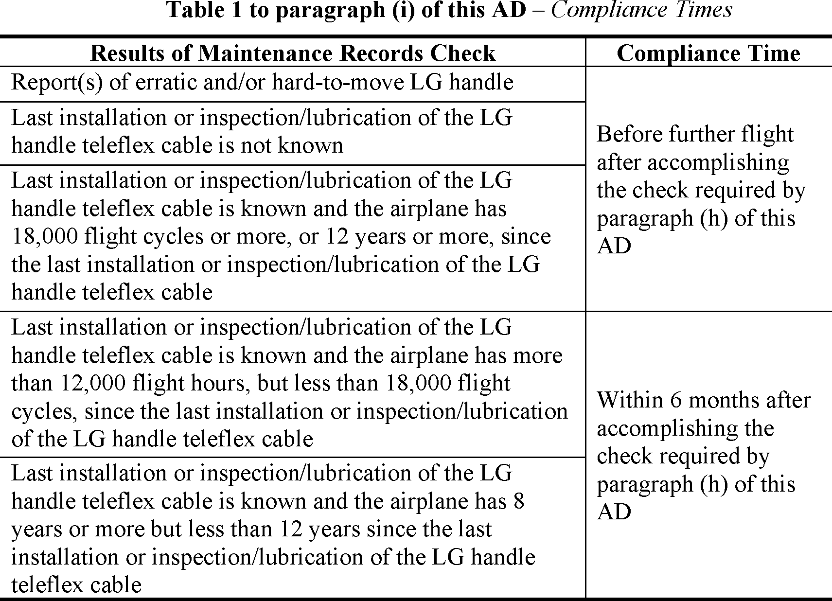 If, during the inspection required by paragraph (g) of this AD, a grease nipple is not found installed: Within 3 months after the effective date of this AD, check the maintenance records of the affected airplane for the previous 3 months for reports of an erratic or hard-to-move LG handle, and check the maintenance records to determine the date of the most recent installation, or inspection/lubrication, as applicable, of the LG handle teleflex cable.