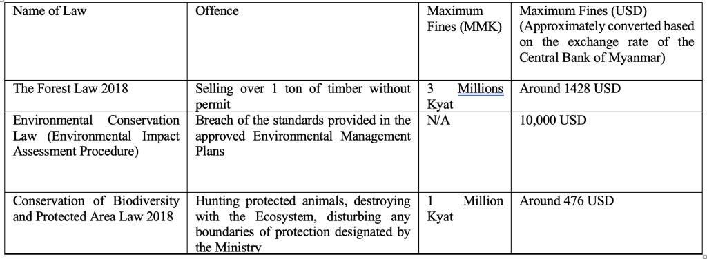 In Myanmar, the concept of corporate crime is relatively new to regulators and law enforcement agencies. This is evident in the recent laws that regulate the Environmental Human Rights (EHR) Protection Agenda. The notion of corporate social responsibility related to EHR was only introduced in 2012 through the Environmental Conservation Law and the Environmental and Social Impact Assessment (EIA) Procedure in 2015. Other regulatory developments include the Myanmar Investment Law and Rules, which establish a licensing procedure for projects with significant environmental and community impacts, the Conservation of Biodiversity and Protected Area Law of 2018, and the Forest Law of 2018. For the purpose of this article, these laws will be collectively referred to as “the Legal Framework.”