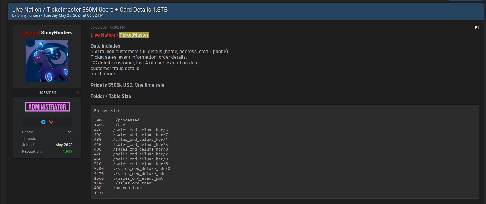 Multiple media outlets reported Wednesday that 560 million Ticketmaster customers may have been compromised in a data breach by ShinyHunters, a known hacker group.